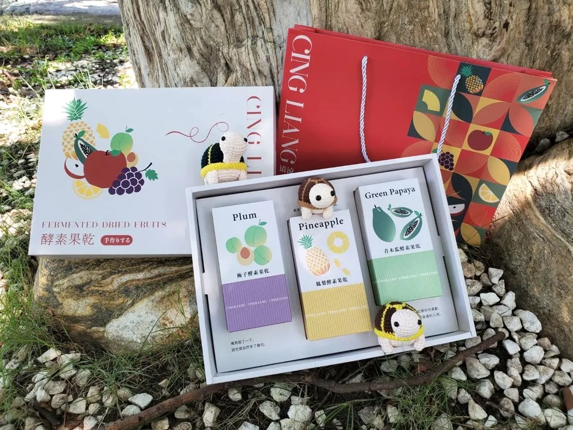 「酵素果乾禮盒」內含三種不同口味的酵素果乾,梅子、鳳梨、青木瓜,可以一次品嘗到多種風味。禮盒的整體設計走的是清新簡約風,第一眼就讓人覺得很有質感,產品讓人有種輕盈、無負擔的形象。
