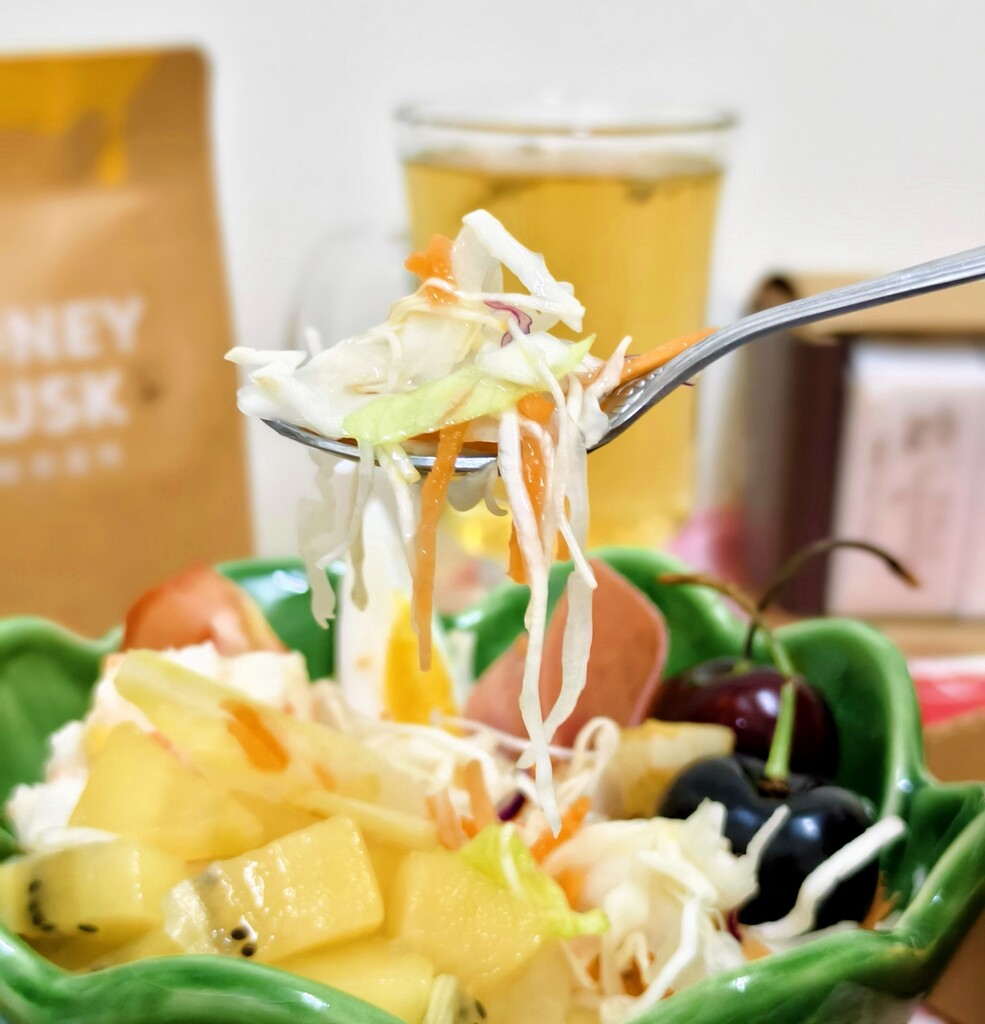 稀釋後的「清涼酵素 綜合水果酵素」+鳳梨汁加入生菜當中。