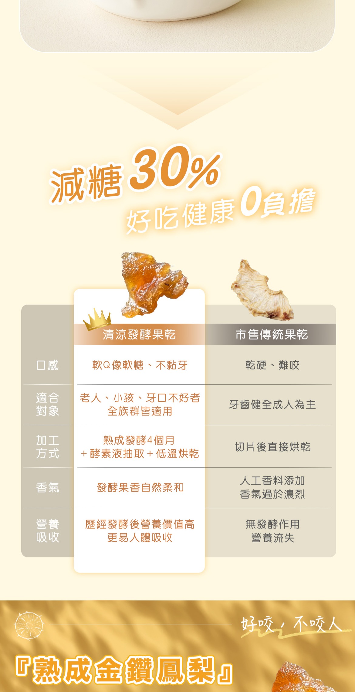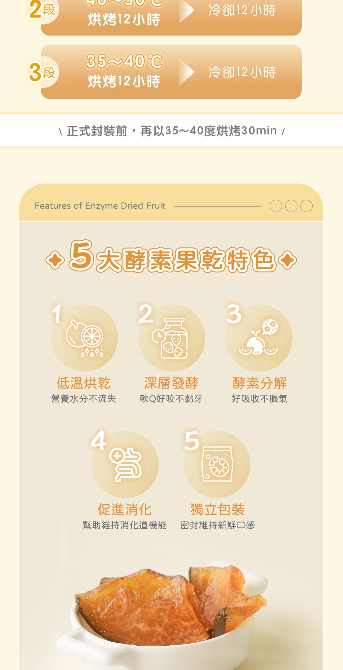 大部分的果乾只是簡單烘乾,這款果乾則是「先釀再烘」,先用糖進行酵素發酵,糖只是為了發酵作用,不會像蜜餞那樣死甜。