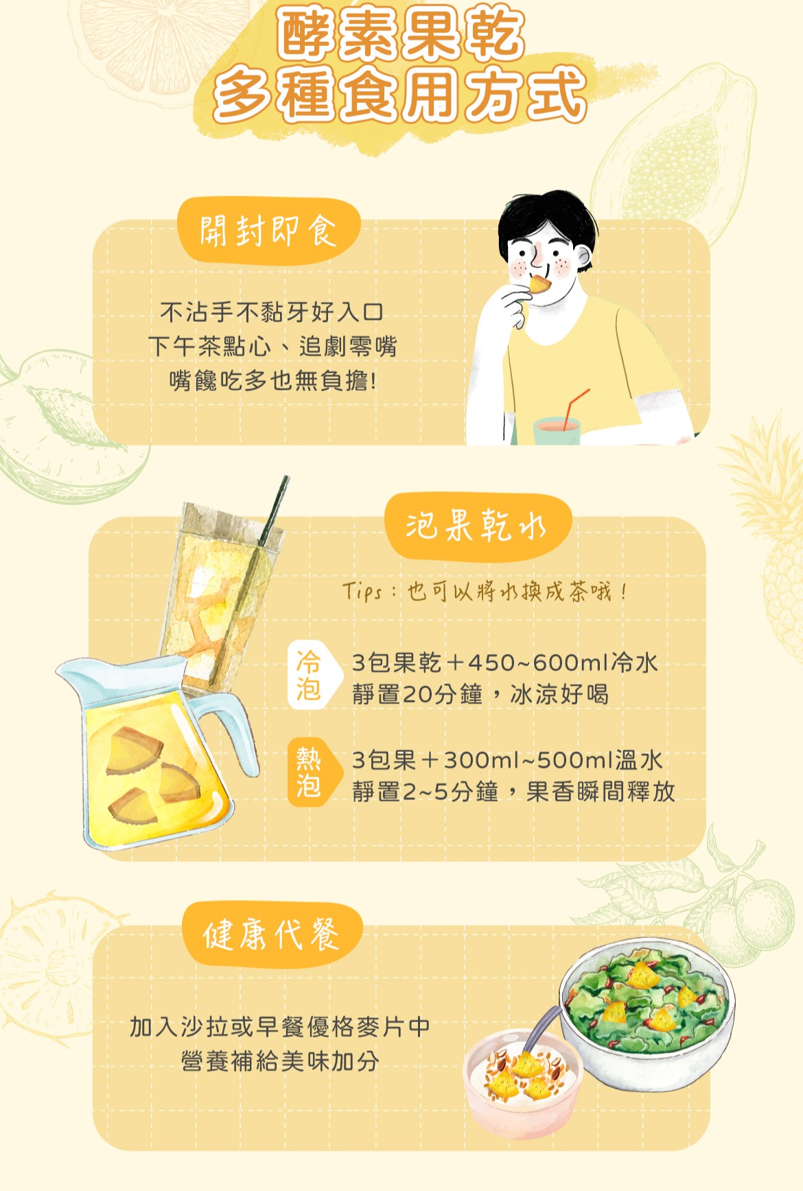 - 熱泡法:3包果乾加溫水,泡5分鐘,酸香濃郁。