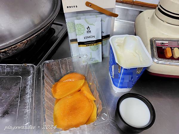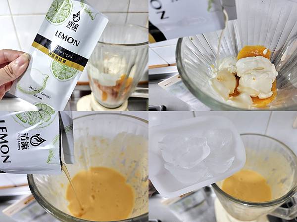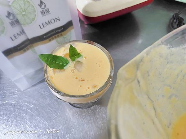 這款芒果風味的甜拉西,是請ChatGPT推薦適合搭配檸檬酵素的版本,製作迅速,把所有材料放入果汁機攪打,即完成。