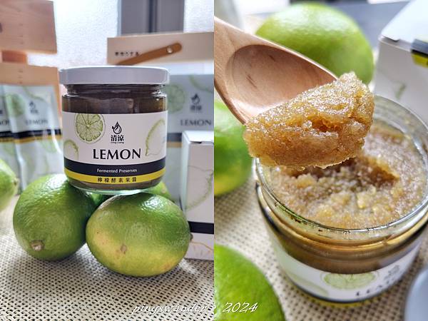 原料是無籽檸檬,加入檸檬、冰糖、醋、鹽,採用無加熱的天然菌種發酵,無添加商用果膠或其他化學成分,跟果醬在同一個桶子裡天然製成。